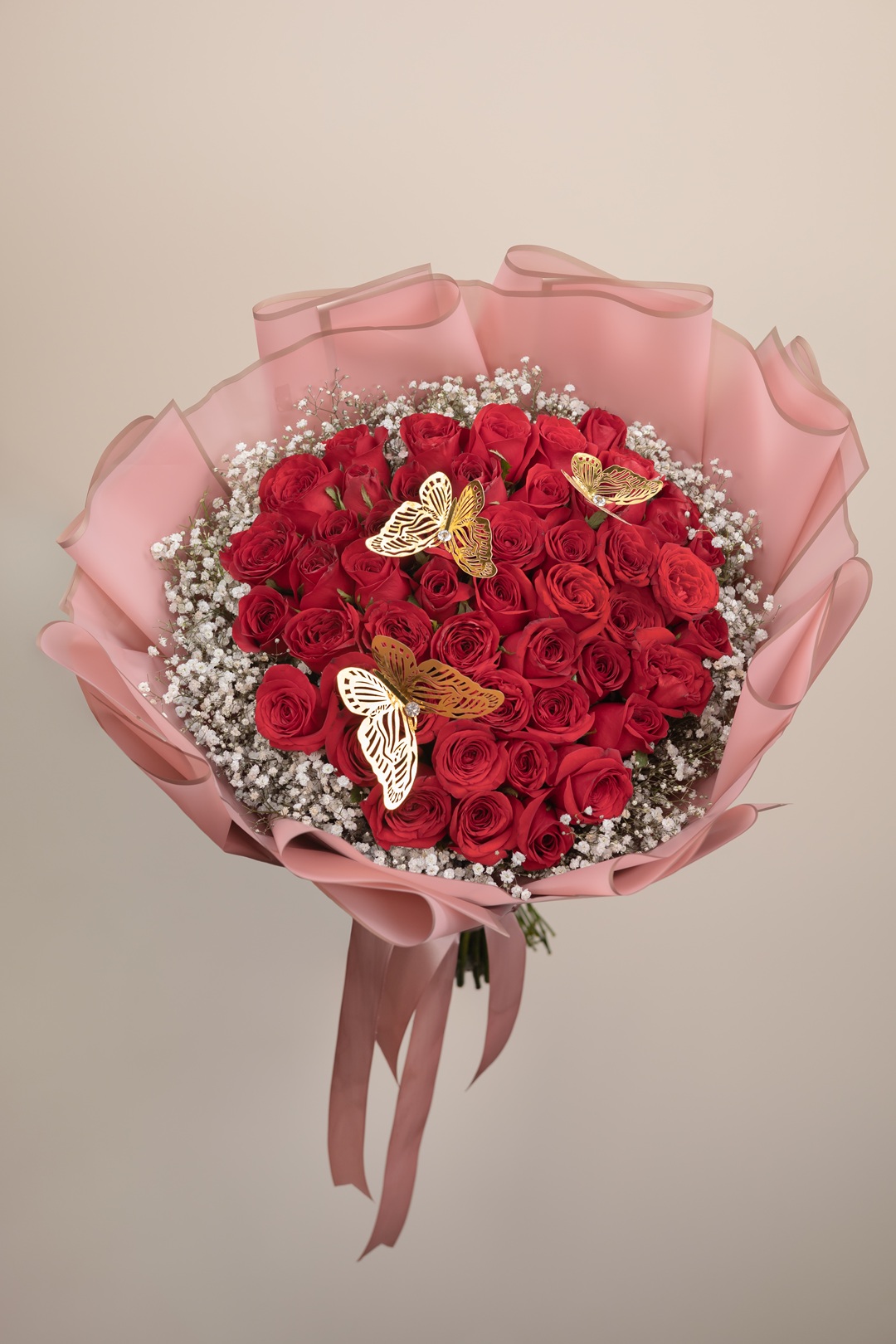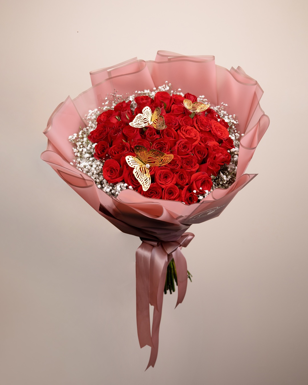 Es un ramo que rinde tributo a los sentimientos más puros y duraderos. Compuesto por 50 rosas rojas perfectamente acomodadas en forma circular, rodeadas de un halo de gypsophila blanca que aporta textura y suavidad, este diseño se enriquece con …