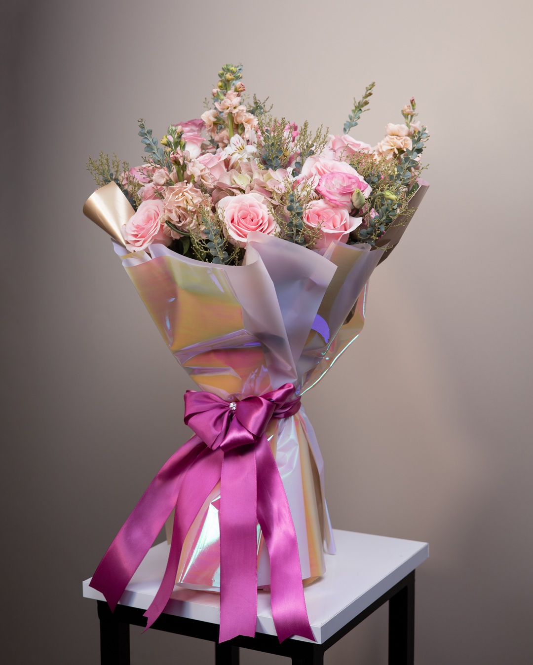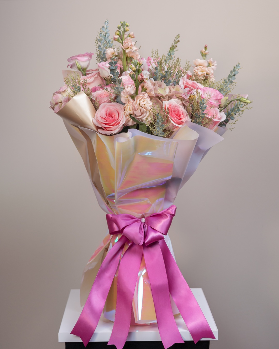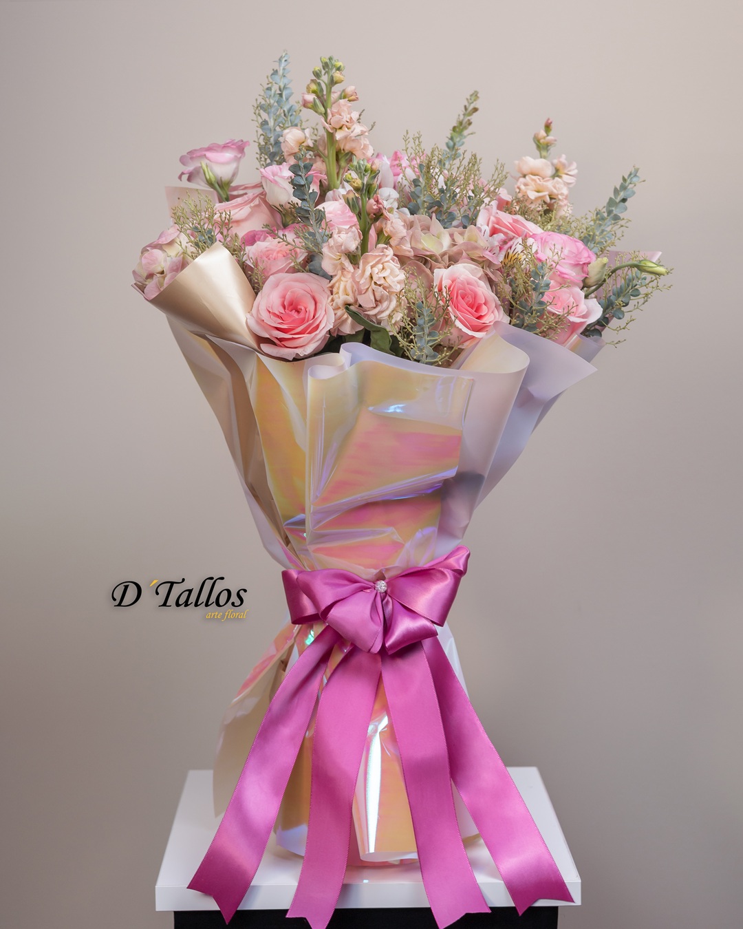 Es un bouquet de inspiración contemporánea que deslumbra por su feminidad, elegancia y dulzura. Compuesto por rosas en suaves tonos rosados, lisianthus, flores de stock y follaje verde-azulado, cada flor ha sido cuidadosamente elegida para …