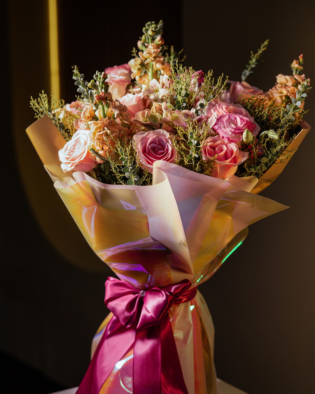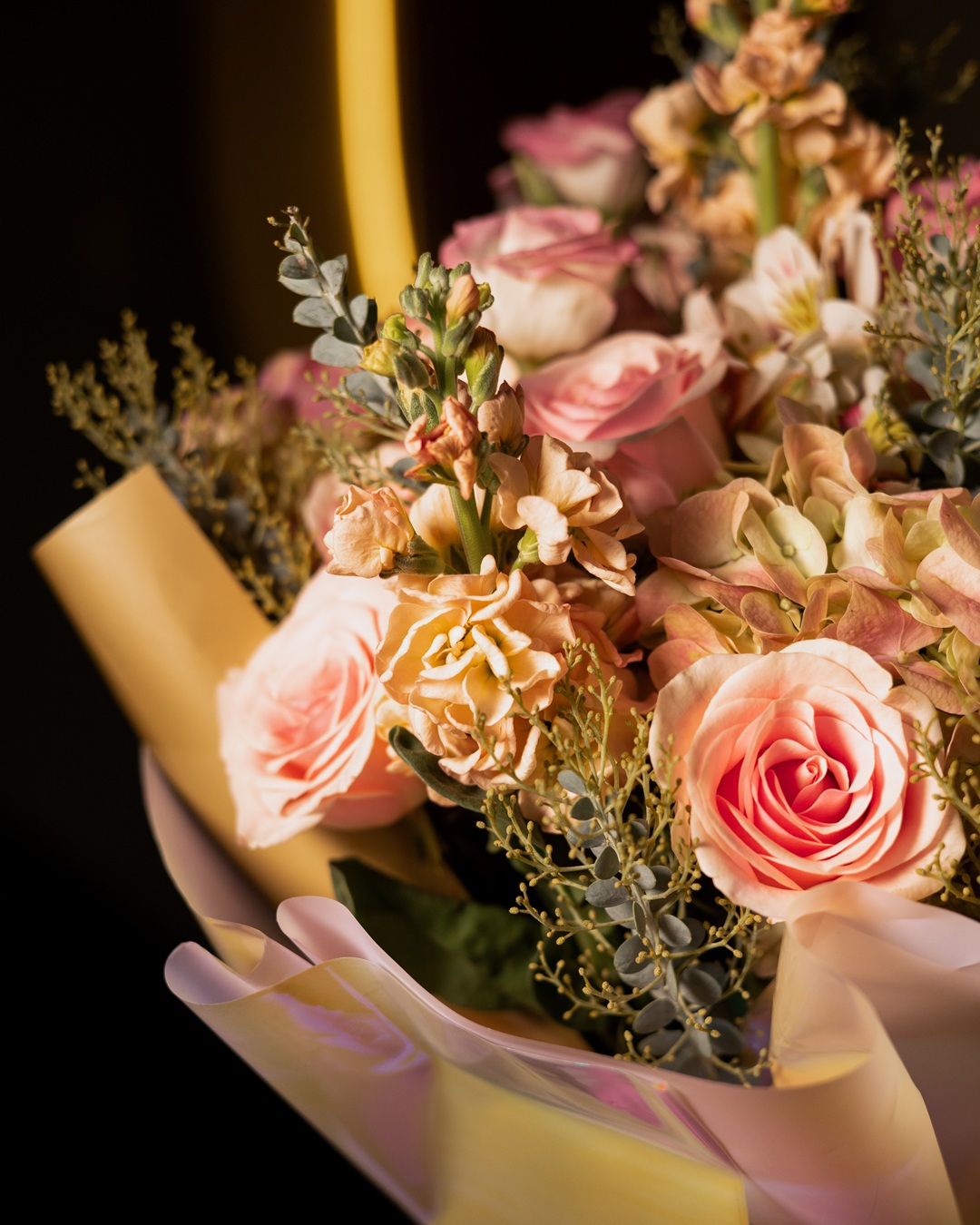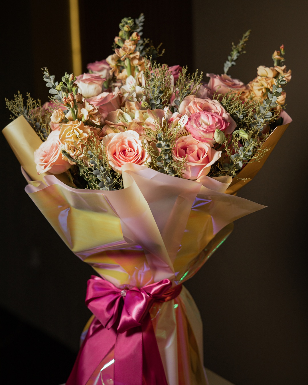 Es un bouquet de inspiración contemporánea que deslumbra por su feminidad, elegancia y dulzura. Compuesto por rosas en suaves tonos rosados, lisianthus, flores de stock y follaje verde-azulado, cada flor ha sido cuidadosamente elegida para …
