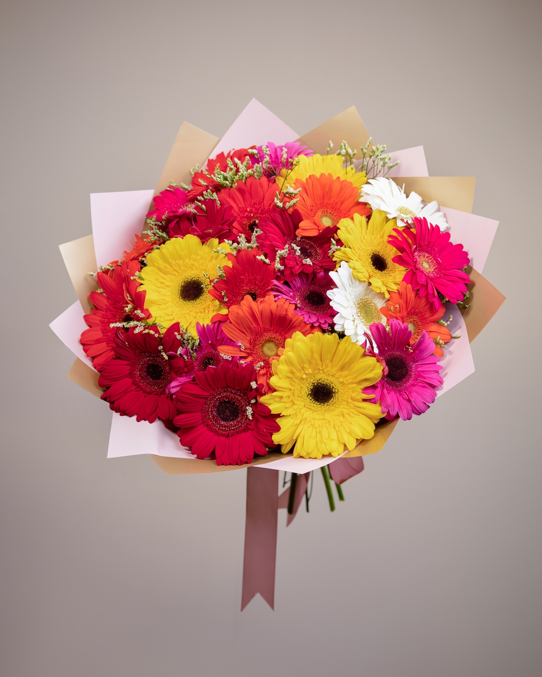 Es una celebración de alegría en su máxima expresión. Compuesto por una selección de gerberas en tonos rojo, fucsia, naranja, amarillo, blanco y magenta, este ramo es ideal para levantar el ánimo y llenar cualquier espacio de vitalidad. El …