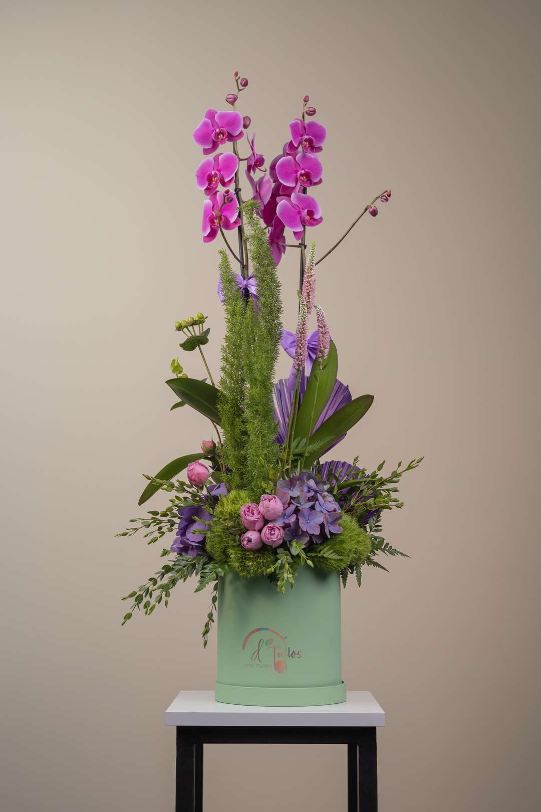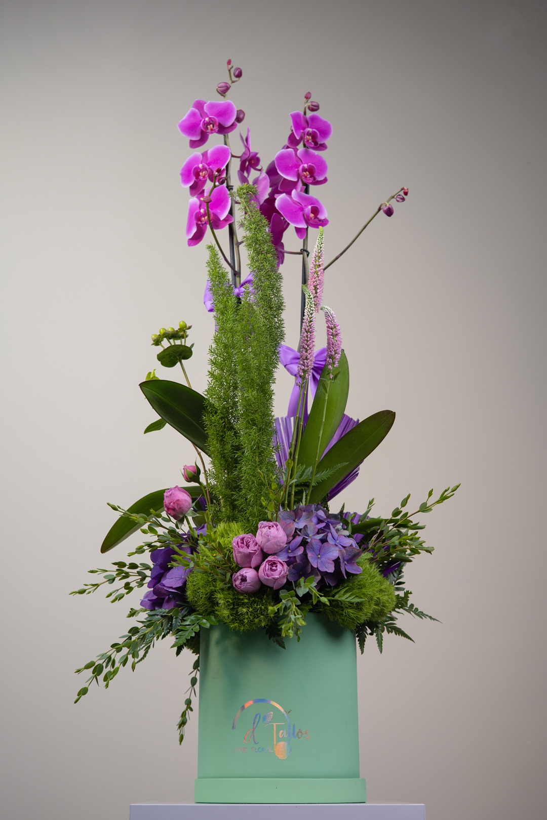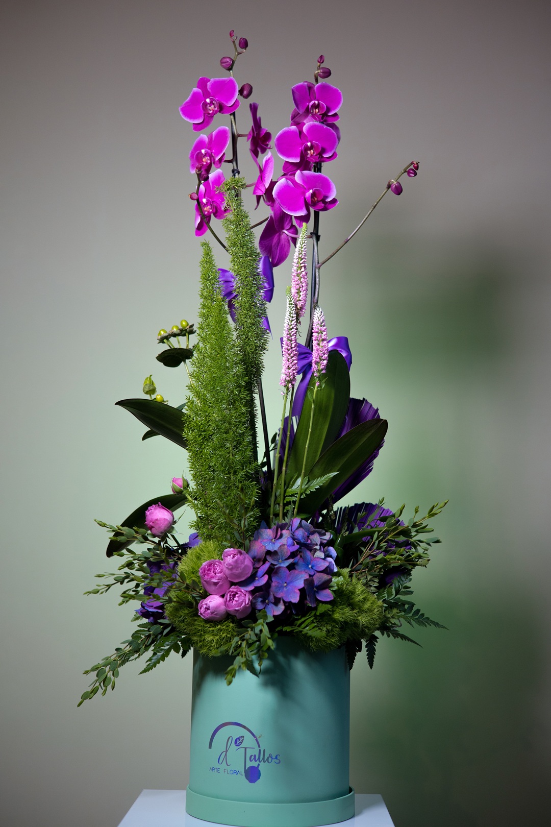 Es un diseño floral que eleva el arte botánico a un nivel escultural. Sus orquídeas phalaenopsis en tono fucsia intenso emergen con elegancia sobre un lecho de hortensias lilas, rosa inglesa, liatris, follaje exótico y un vibrante juego de …