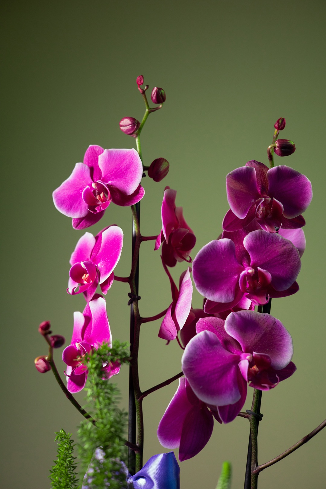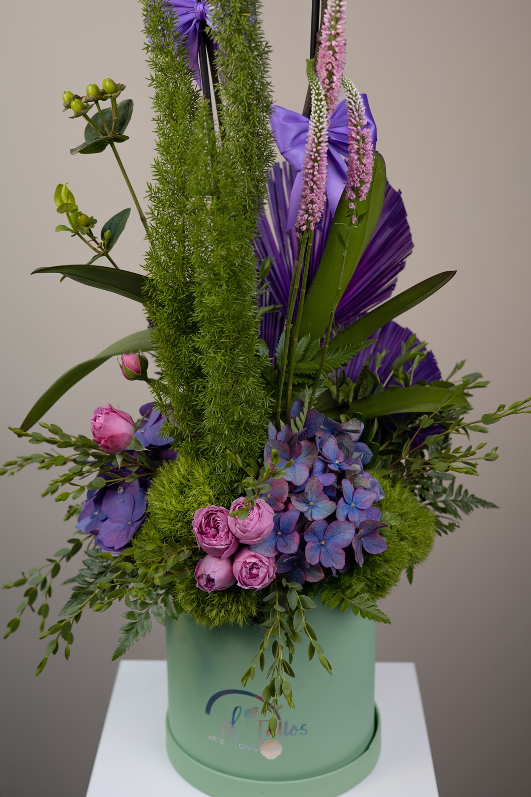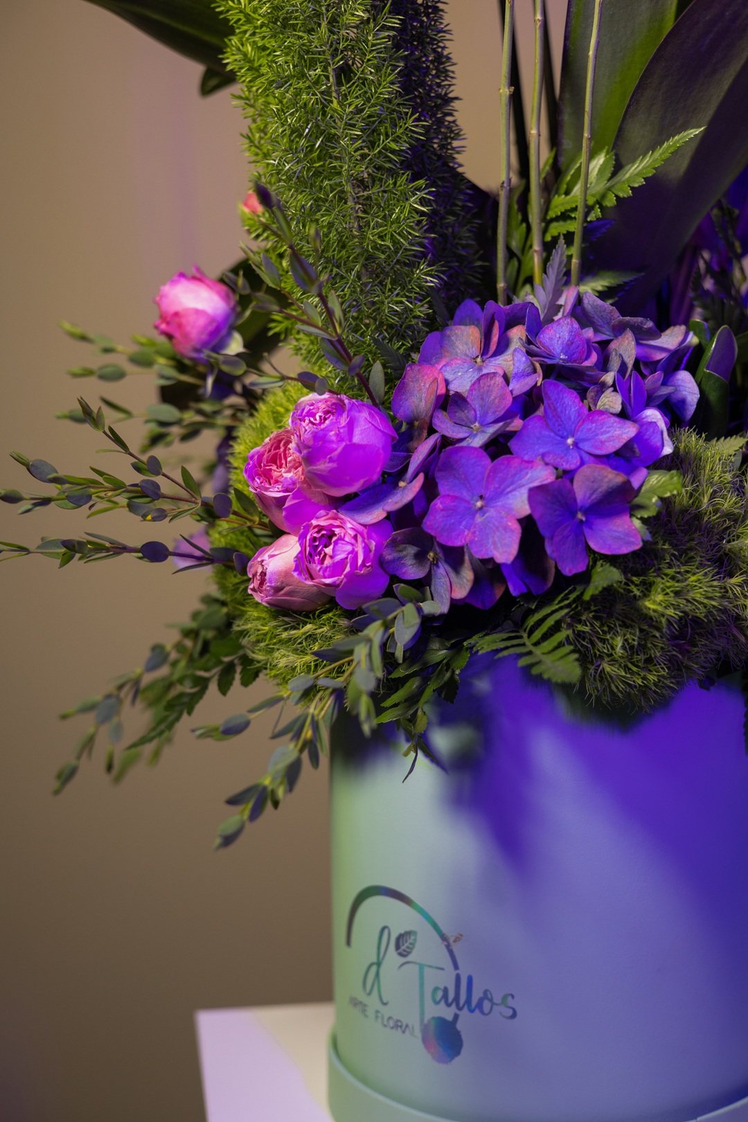 Es un diseño floral que eleva el arte botánico a un nivel escultural. Sus orquídeas phalaenopsis en tono fucsia intenso emergen con elegancia sobre un lecho de hortensias lilas, rosa inglesa, liatris, follaje exótico y un vibrante juego de …