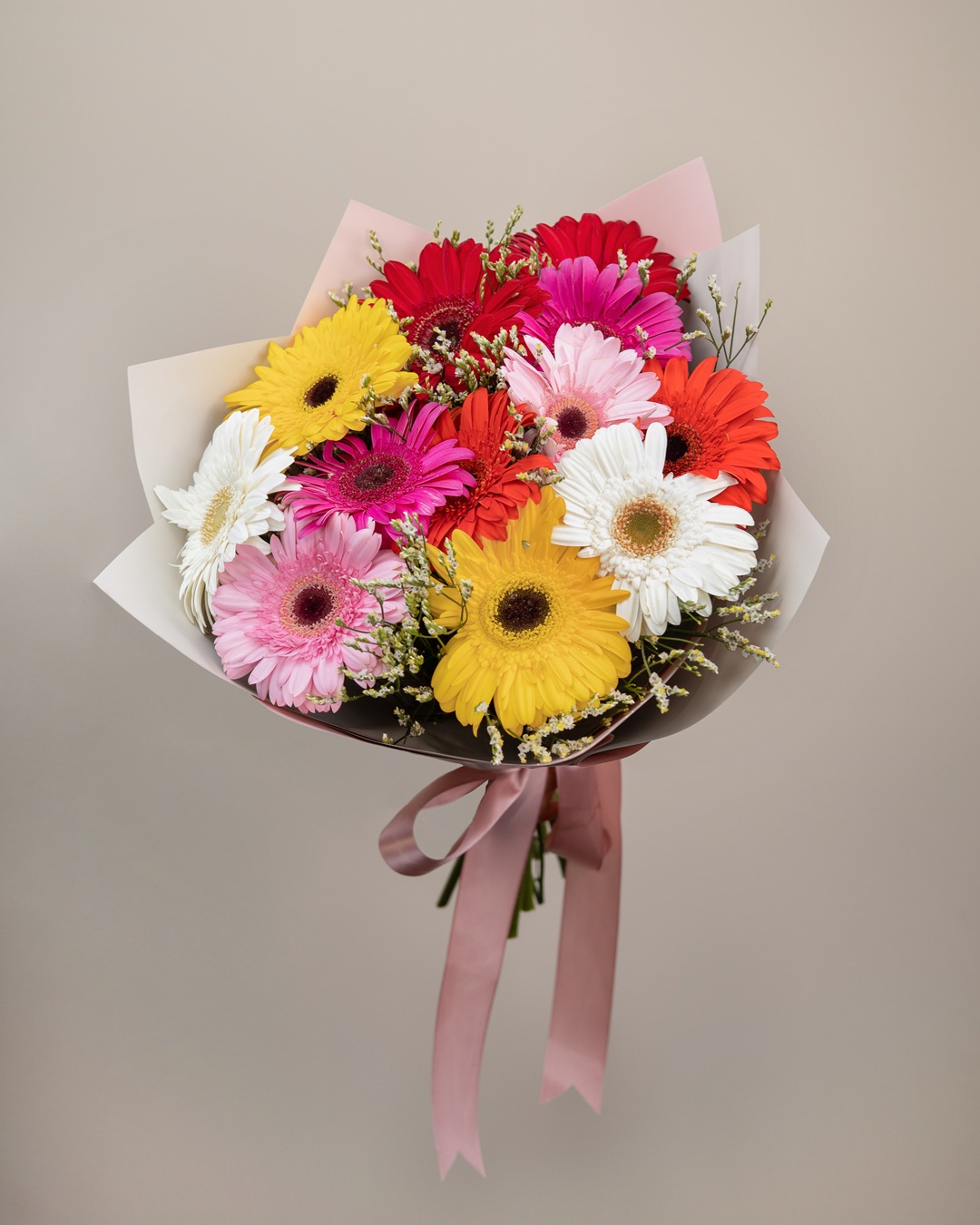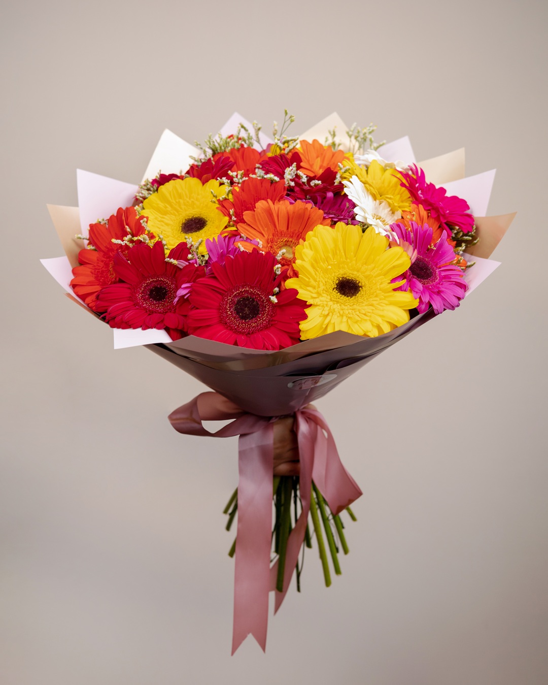 Es un bouquet lleno de color y optimismo. Compuesto por una variedad de gerberas en tonos amarillo, blanco, rosa, rojo, fucsia y naranja, y acentuado con follaje delicado, este diseño transmite alegría, energía y ternura. Envuelto en papel …