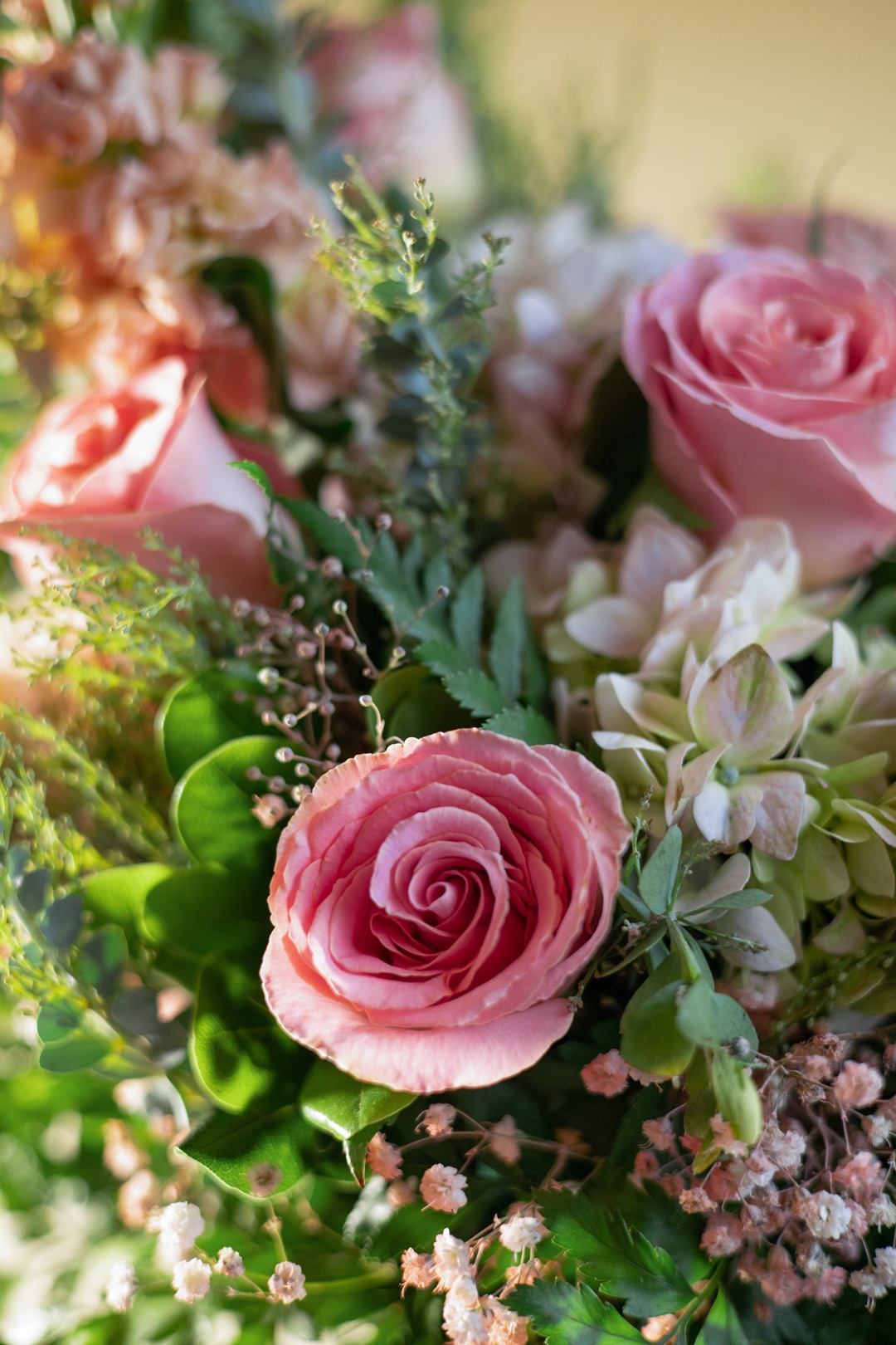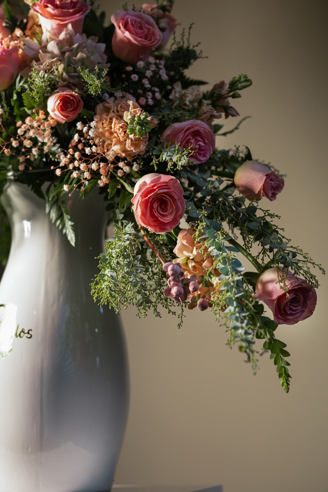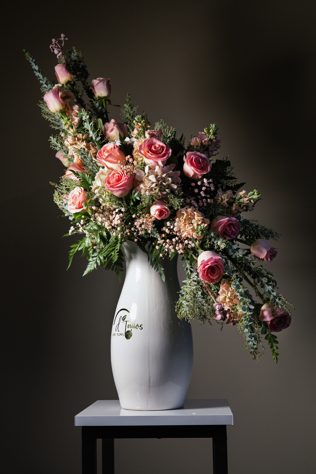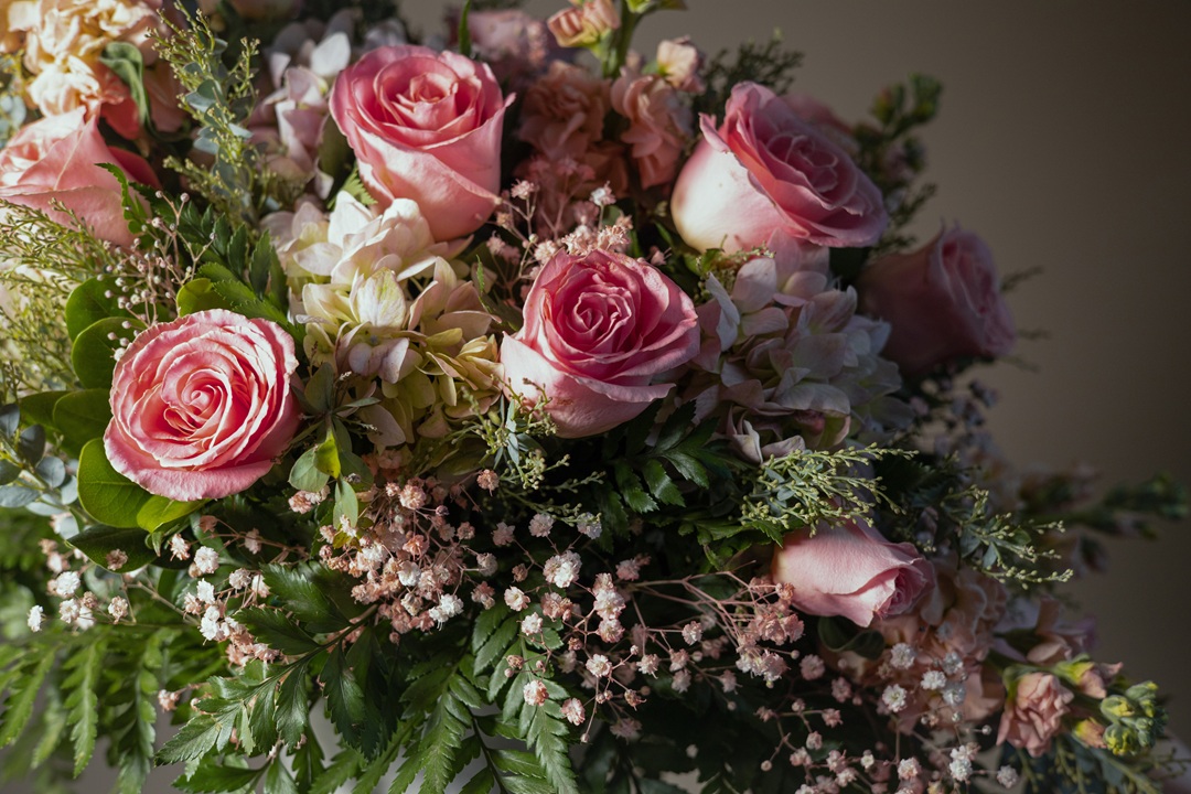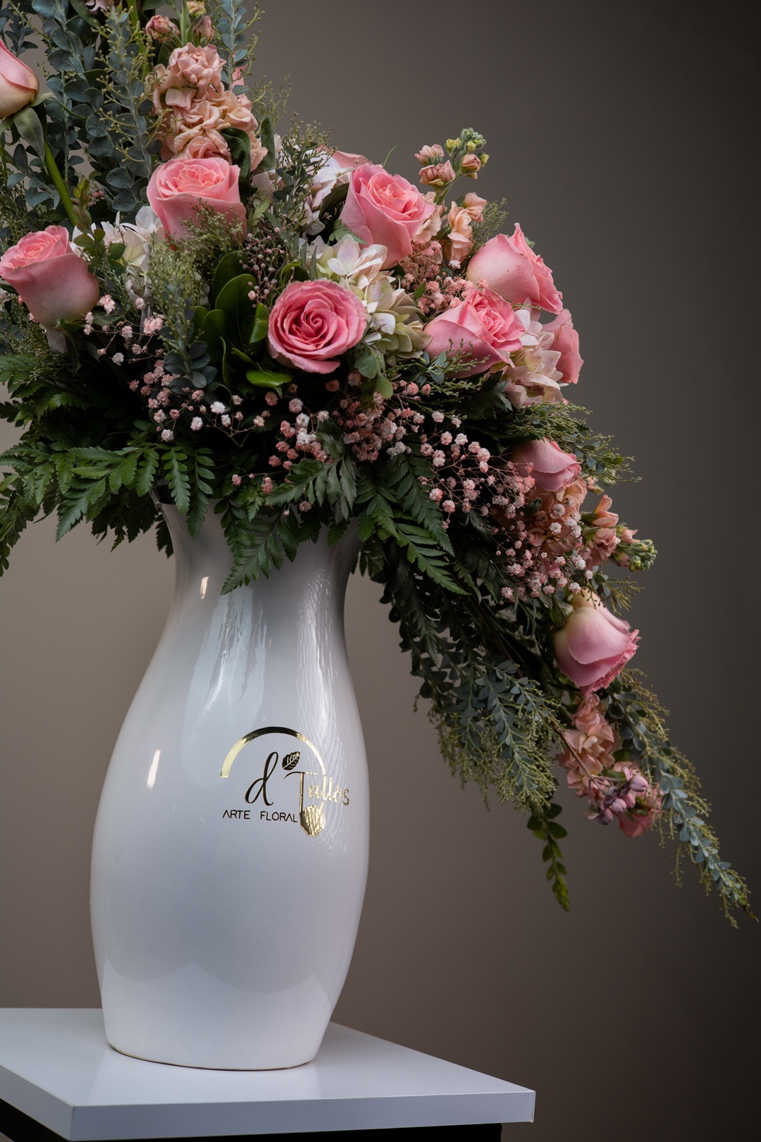 Es un diseño floral que habla con suavidad. Su composición vertical y en caída, estructurada con rosas en tono rosa pastel, hortensias blancas, flores de stock, gypsophila y follaje fino, crea un efecto visual de ligereza y armonía. Presentado …